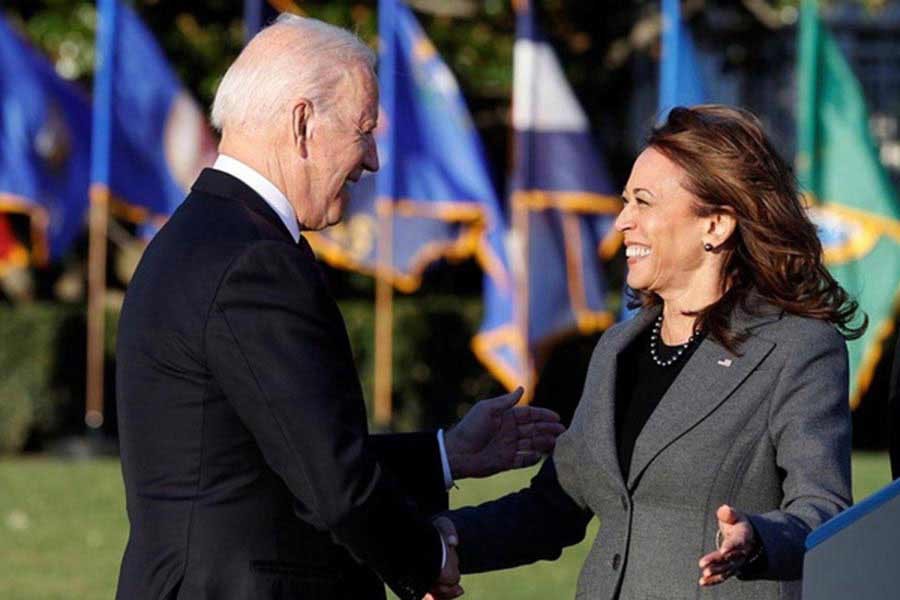 US President Joe Biden and Vice-President Kamala Harris shaking hands during a ceremony to sign the "Infrastructure Investment and Jobs Act", on the South Lawn at the White House in Washington on November 15 this year –Reuters file photo