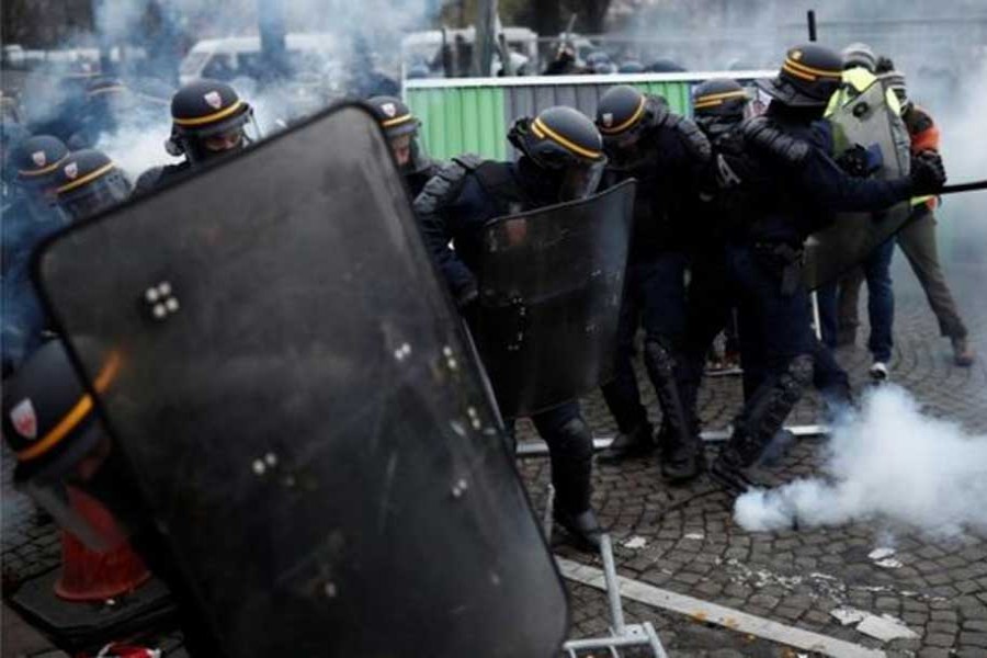 Video posted on social media showed firecrackers being thrown at police as protesters shouted slogans calling for President Emmanuel Macron to resign.