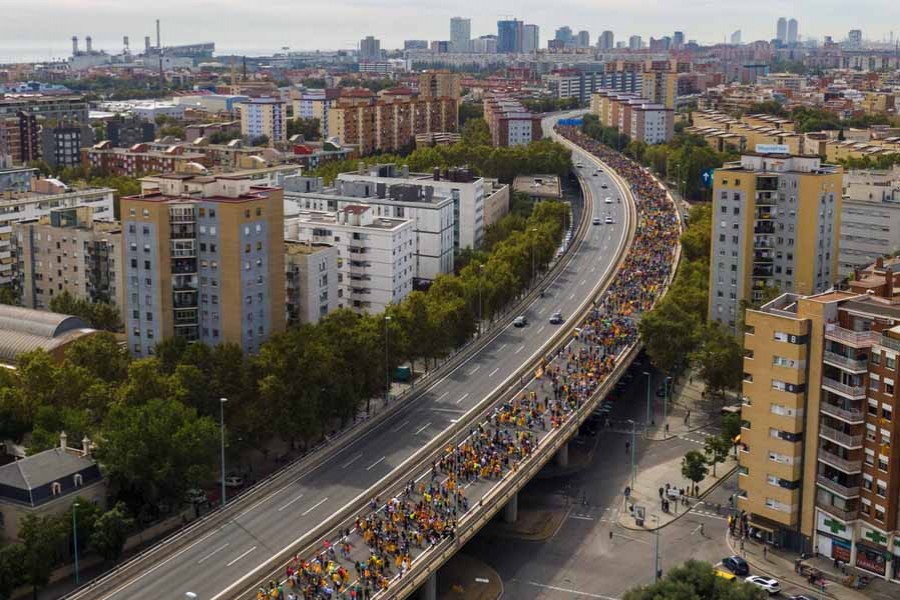 Highways were occupied by thousands of people joining five marches from inland towns that were expected to converge in Barcelona's city centre on Friday afternoon for a mass protest alongside striking students and workers.