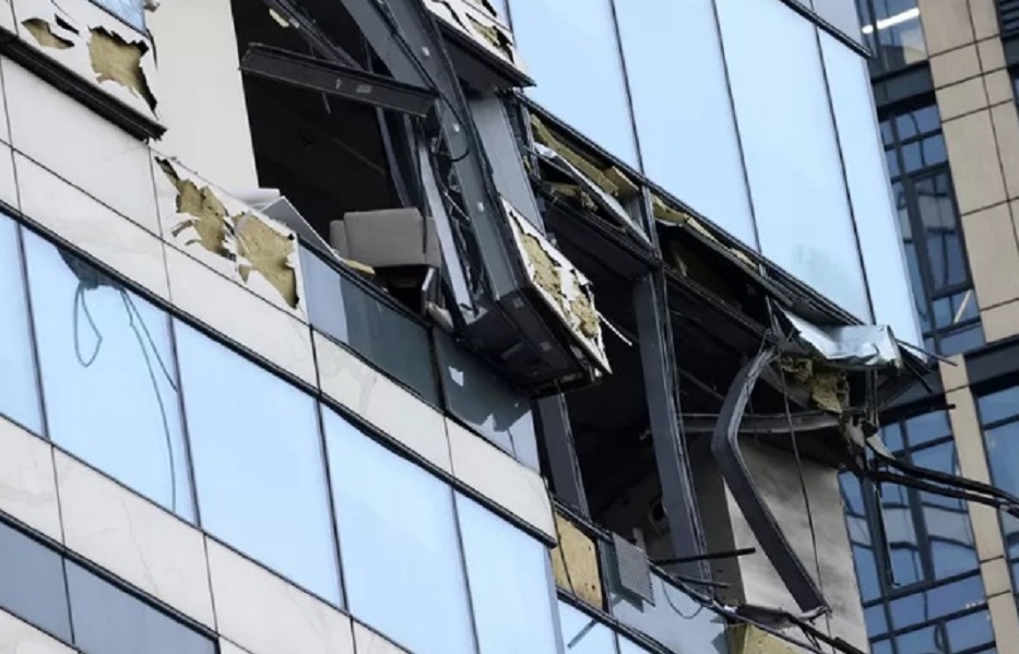 Photos from the scene show that several windows have been damaged at the corner of the buildings, with debris scattered on the ground below.