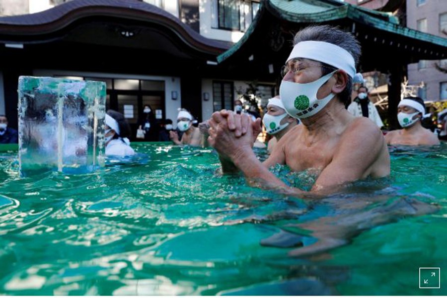 Men wearing traditional loin clothes and women dressed in white robes clapped and chanted before going into an ice water bath during a Shinto ritual at a Tokyo shrine on Sunday to purify the soul and pray for the end of the COVID-19 pandemic, reports Reuters.