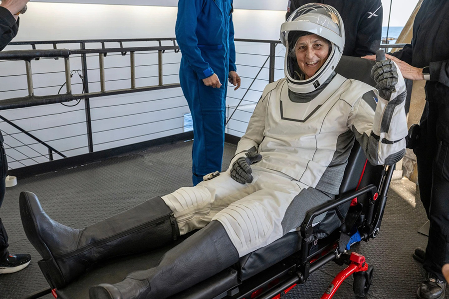 Dolphins circled the capsule as divers readied it for hoisting onto the recovery ship. Once safely on board, the side hatch was opened and the astronauts were helped out, one by one. Williams was next-to-last out, followed by Wilmore who gave two gloved thumbs-up.