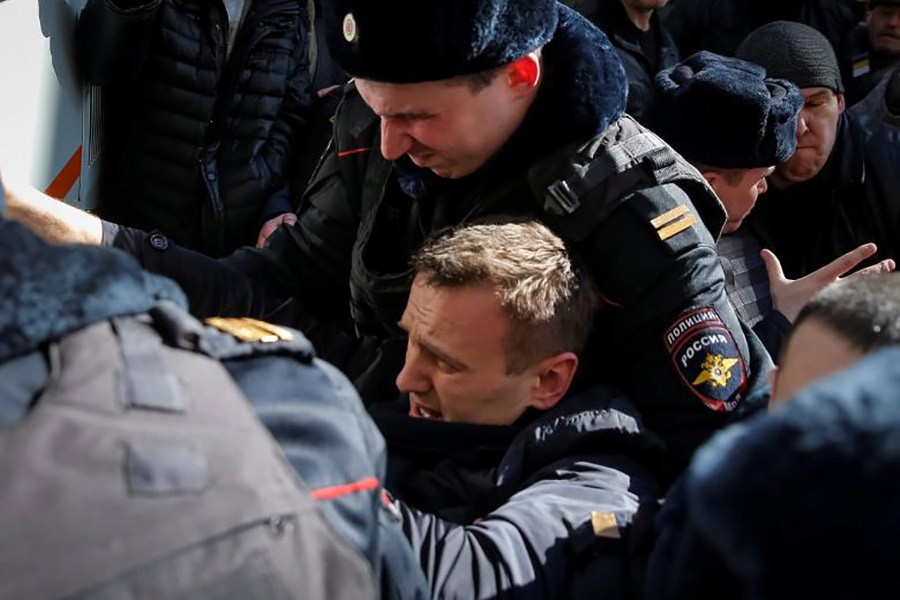 Russian police detained opposition leader Alexei Navalny on Sunday moments after he appeared at a rally to urge voters to boycott the 'rigged presidential election' in March.