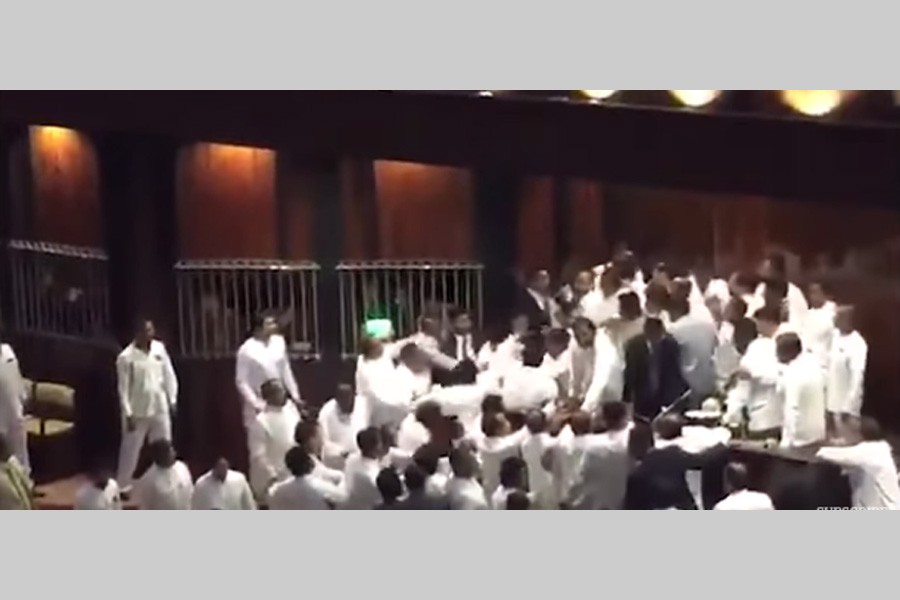 The speaker, Rajapaksa and Wickremesinghe all eventually left the chamber as the fighting continued.