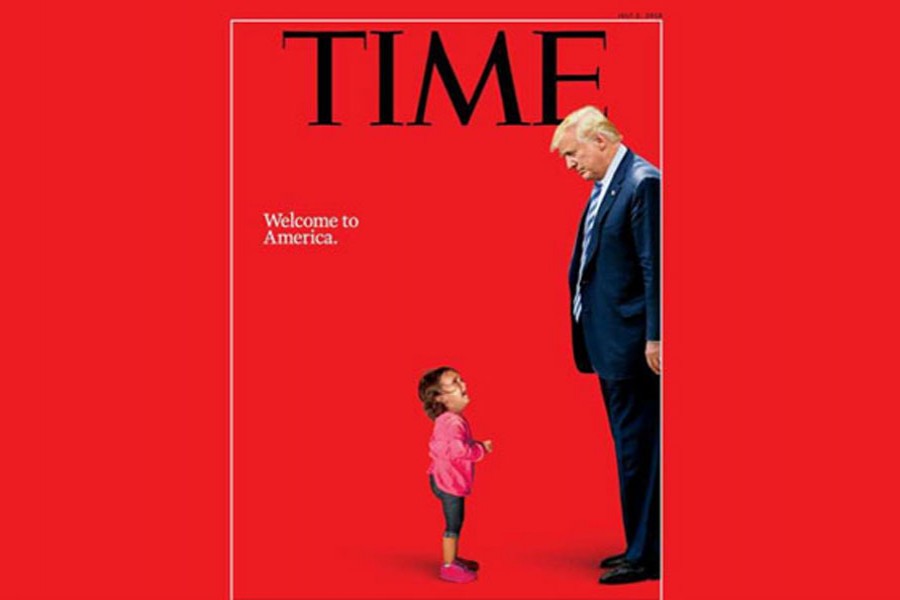 In white, small letters on a background of deep red, the words "Welcome to America" are printed. What amplifies the cover's bright, solid colour is a photo of Donald Trump in dark suits looking down at a small girl in pink jacket, who cannot stop crying. The girl stands with her hands folded. Donald Trump carries either a faint smile or the beginning of what may eventually turn into a full smirk, reports ndtv.com.