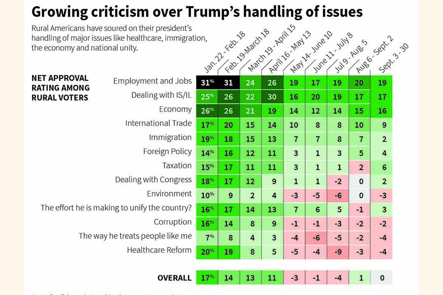 According to the Reuters/Ipsos daily tracking poll, the Republican president’s popularity is eroding in small towns and rural communities where 15 per cent of the country’s population lives. The poll of more than 15,000 adults in “non-metro” areas shows that they are now as likely to disapprove of Trump as they are to approve of him.