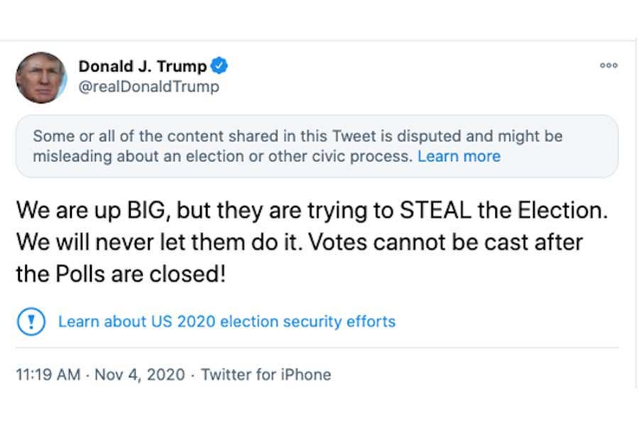 Twitter hid a Trump tweet that claimed: “we are up BIG, but they are trying to STEAL the Election” behind a label that said it was potentially misleading. The company also restricted users’ ability to share the post.