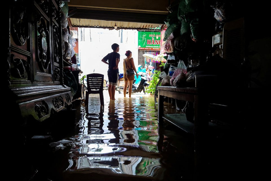 Shop owners stand inside their flooded shop following the impact of Typhoon Yagi, in Hanoi, Vietnam, September 11, 2024. REUTERS/Khanh Vu/Files