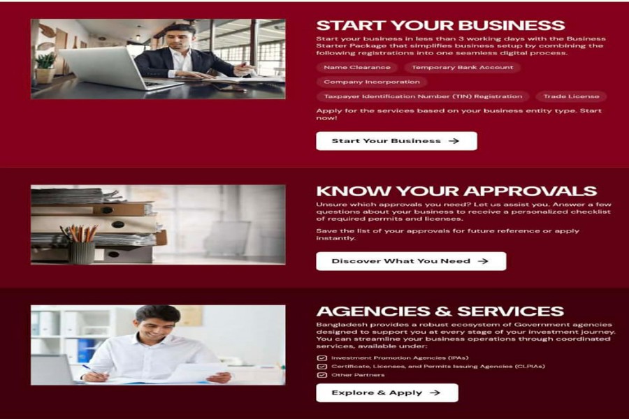 Start with the business starter package: For anyone launching a new venture, whether a local startup, an SME, or a foreign-invested company, the centrepiece of the portal is the Business Starter Package. Through a single, unified application, it delivers five critical approvals in sequence: name clearance, a temporary bank account, company incorporation via RJSC, e-TIN registration, and a trade licence. The entire process is designed to conclude within three working days.