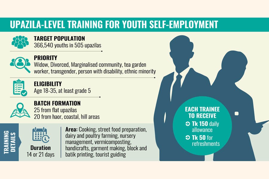 The government plans short-term training programmes for 366,540 young people in 505 upazilas nationwide to help half of them become self-employed by June 2028, planning ministry sources say.