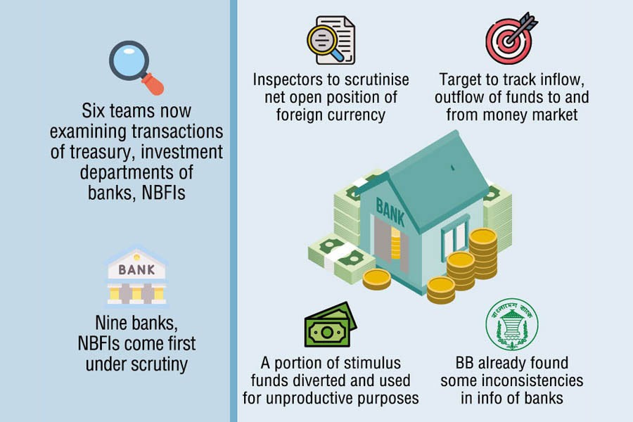 At least six teams of the Bangladesh Bank (BB) are now probing different transactions of treasury and investment departments of the banks and non-banking financial institutions (NBFIs), officials said.