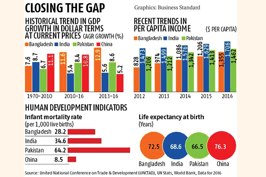 "At $1,355 in 2016, Bangladesh's per capita income was up 40 per cent in three years against 14 per cent growth in India and 21 per cent growth in Pakistan," it added.