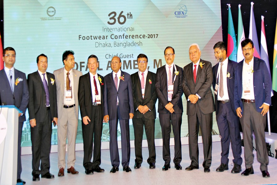 Commerce Minister Tofail Ahmed, flanked by other dignitaries, poses for a photograph during the inauguration of the 36th International Footwear Conference (IFC) 2017 of the Confederation of International Footwear Associations (CIFA) in Dhaka on Wednesday. Leathergoods and Footwear Manufacturers and Exporters Association of Bangladesh (LFMEAB) has organised the programme. — FE Photo