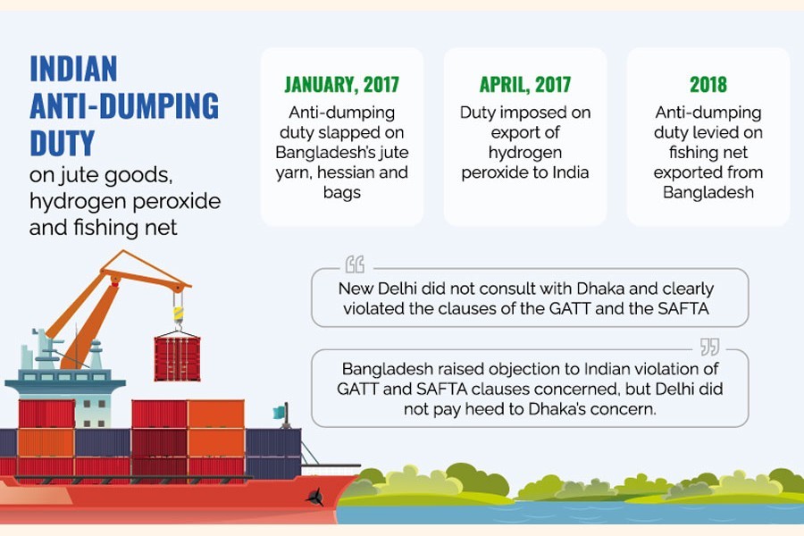 Presently, Indian anti-dumping duty is applicable to exports of at least three Bangladeshi items-jute goods, hydrogen peroxide and fishing net.