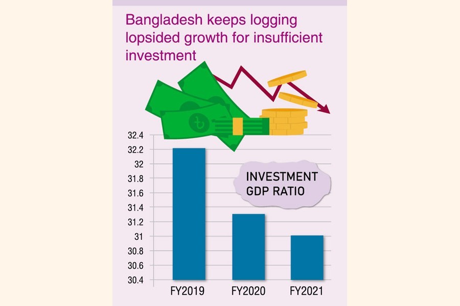Bangladesh Bureau of Statistics (BBS) showed that although the gross domestic product (GDP) growth in the last fiscal year (FY) 2020-21 rebounded with doubling the rate than in the previous fiscal, the investment-GDP ratio still stayed on the lower trajectory.