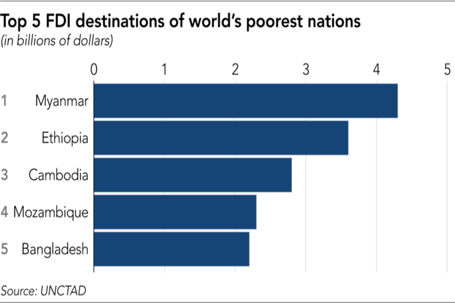 World Bank data show Cambodia's FDI of just under $2.8bn was double the total from just 7 years before, while Bangladesh's $2.15bn marked a drop of almost $700m from a year earlier -- partly due its sluggishness to diversify beyond the country's crucial garment sector.