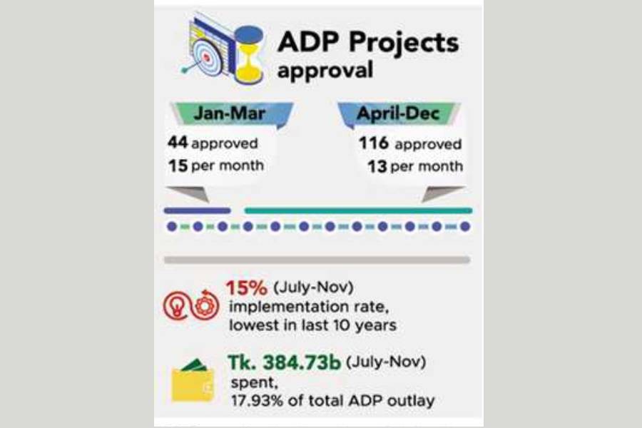 According to the Implementation, Monitoring and Evaluation Division (IMED), the implementation rate of the Tk 2.14 trillion ADP was only 18 per cent in the first five months of FY'21, the lowest in last 10 years.