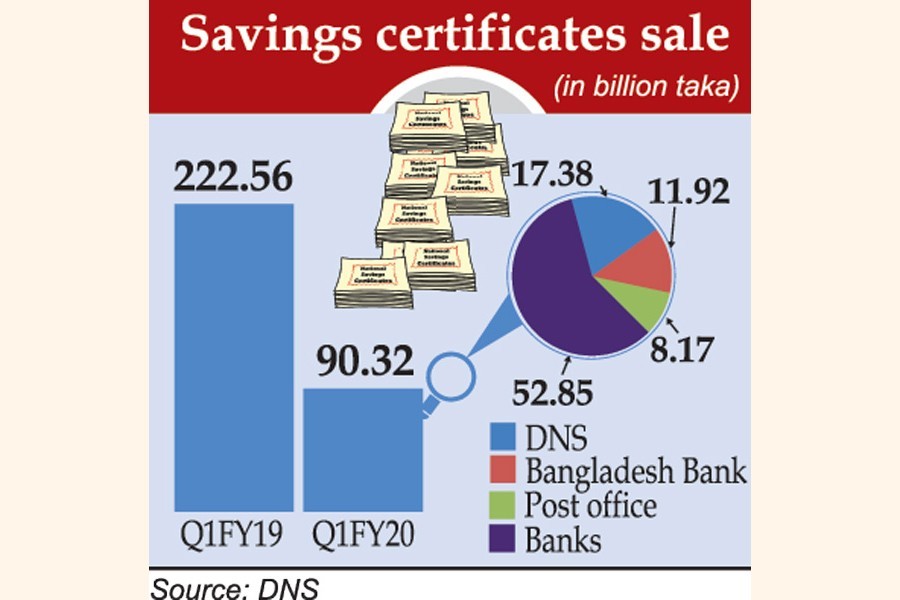 The sales of four popular savings instruments during the July-September period last was Tk 90 billion, a 59.4 per cent decline over the same period a year earlier.