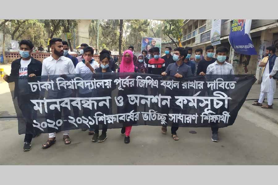 A group of students seeking admission under the 2020-21 academic session have staged a demonstration demanding reinstatement of the previous Grade Point Average (GPA) system for Dhaka University's intake test.