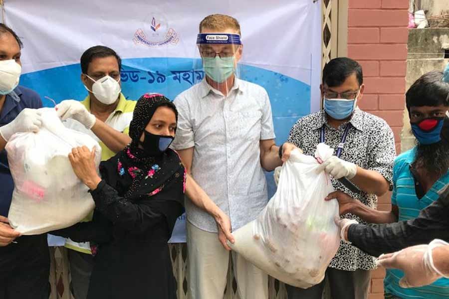 The university distributed foods and other essential commodities to 2,500 families in Uttara, Vatara, Badda, Satarkul and other slums of the capital city on Thursday and Friday.