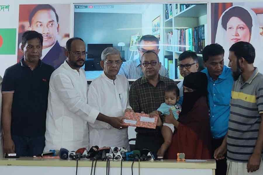 BNP Secretary General Mirza Fakhrul Islam Alamgir handed over the party’s cash assistance to the families of Shahidul Islam Shaon of Munshiganj and Shaon Pradhan of Narayanganj at the party Chairperson’s Gulshan office, reports UNB.