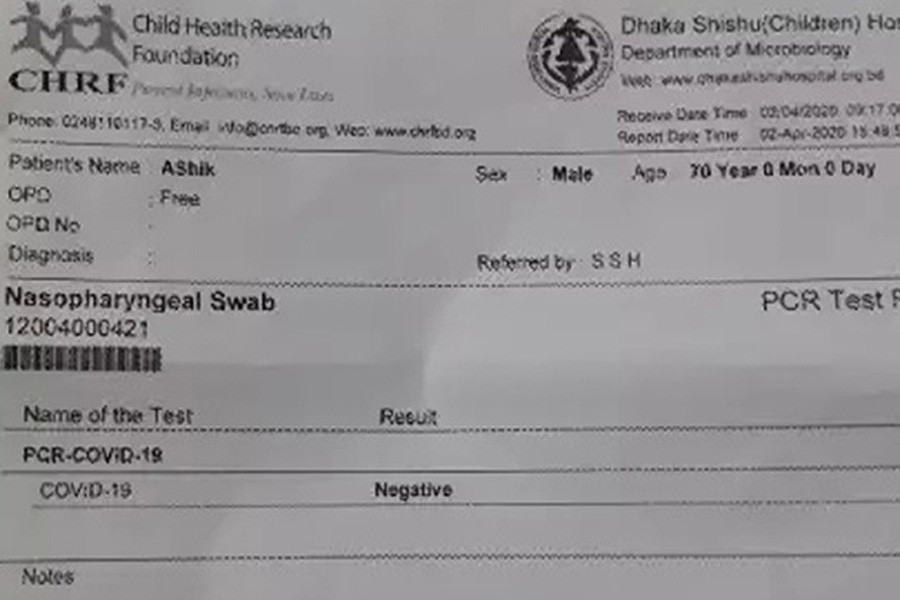 The report made by a lab at the Dhaka Shishu (Children) Hospital came out negative.