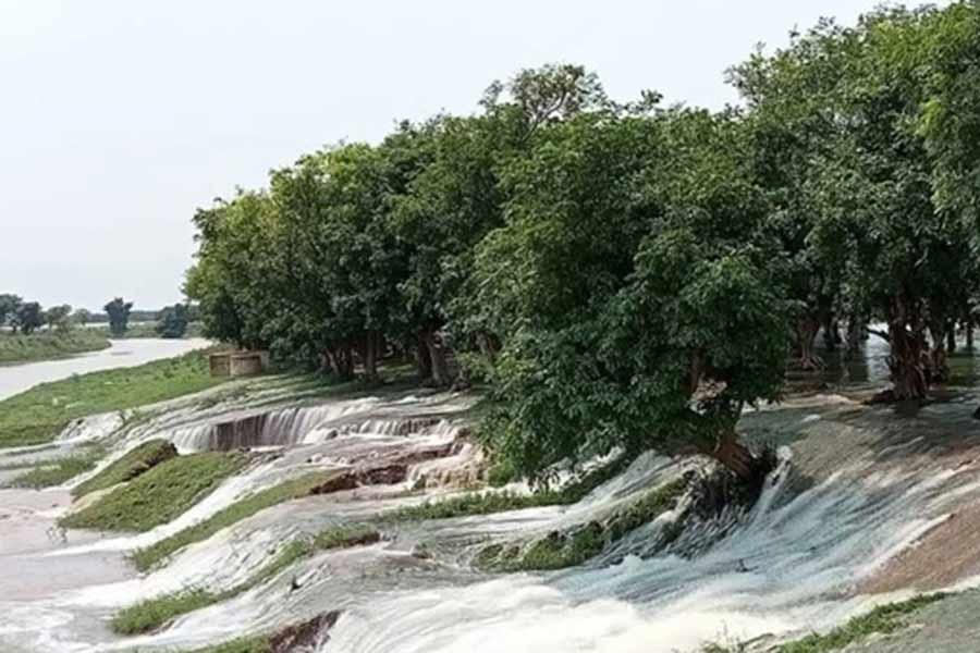 Farmer Khasrul Alam said the dam was breached near the Tanguar Haor watchtower on Sunday morning. Villagers tried to block the water by strengthening the dam, but their efforts failed.