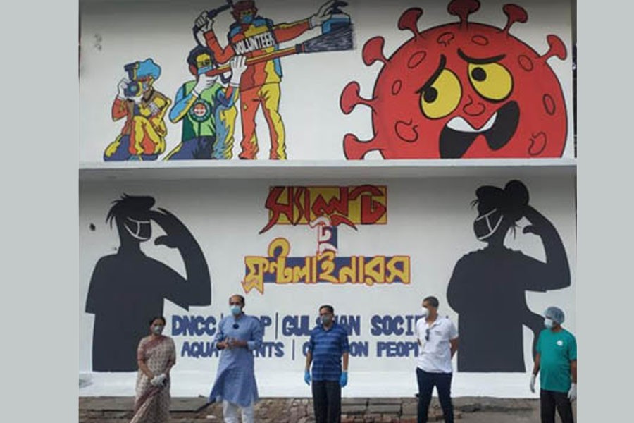 Dhaka North City Corporation (DNCC) and the United Nations Development Programme (UNDP) unveiled two graffities at Gulshan 2, DCC market recently to recognise and thank the frontline workers for rendering essential services during the COVID-19 pandemic in association with the Gulshan Society, Cartoon People and Aqua Paints.