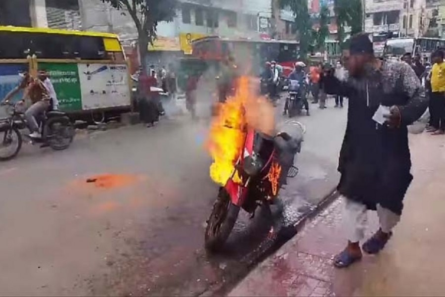 The man is identified as Shawkat Alam Sohel on Facebook, and police said he is a motorcycle rider for a ridesharing service. The video on Facebook shows the motorcycle being burnt on Dhaka’s Badda Link Road in Gulshan on Monday.