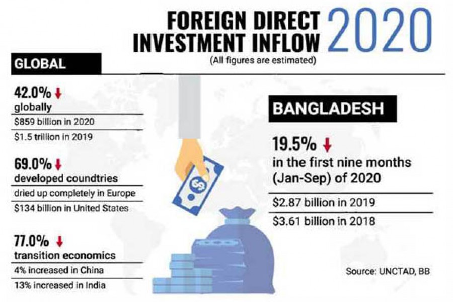 Global inflow of foreign direct investment (FDI) showed a steep fall of US$859 billion in 2020 from $1.5 trillion a year earlier as the fallout of Covid-19, says a UN report.