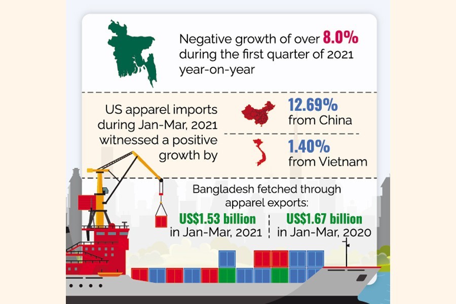 Bangladesh's apparel exports to the US sustained a negative growth of over 8.0 per cent during the first quarter of 2021 year-on-year, showing a much slower recovery compared to China and Vietnam.