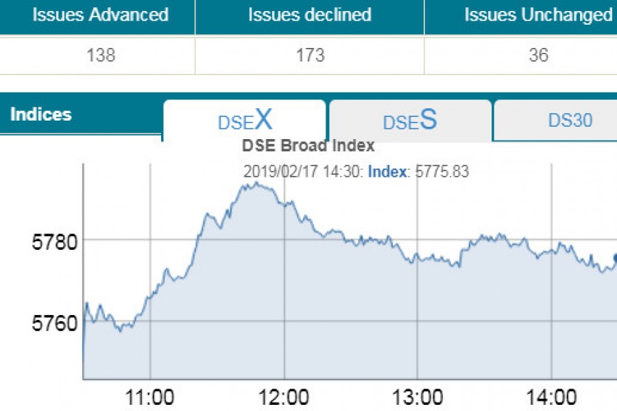 At the end of the session, DSEX, the prime index of the Dhaka Stock Exchange (DSE), settled at 5,775, gaining 25.53 points or 0.44 per cent over the previous day.