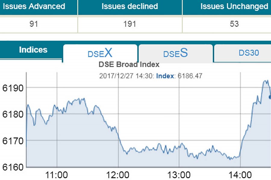 DSEX, the prime index of the Dhaka Stock Exchange (DSE), settled at 6,186, gaining 18.89 points or 0.31 per cent over the previous day.