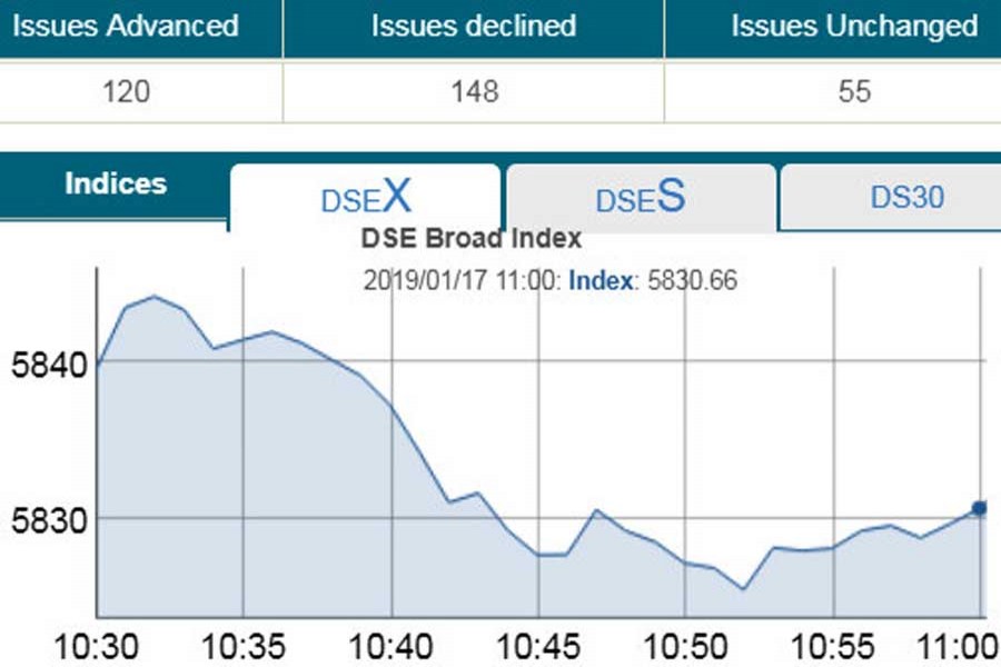 DSEX, the prime index of the DSE, went down by 9.81 points or 0.16 per cent to stand 5,829 points at 11:00am.
