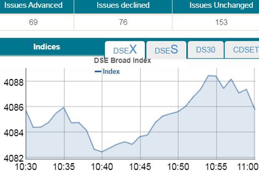 DSEX, the prime index of the DSE, went down by 1.56 points or 0.04 per cent to stand 4,084 points at 11:00 am.