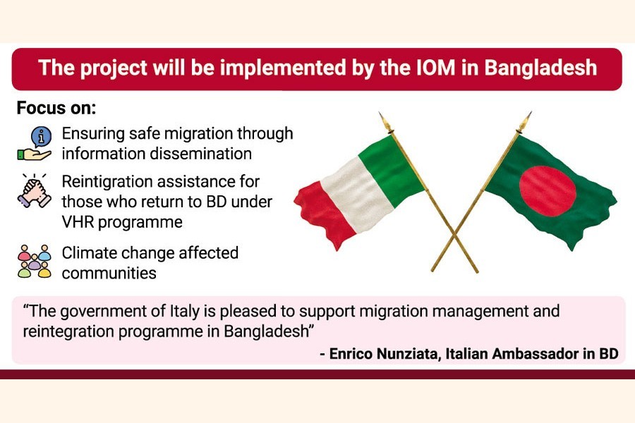 The contribution amounting to US $3.0 million will focus on ensuring safe migration through information dissemination, reintegration assistance for those who return to Bangladesh under the EU-supported Voluntary Humanitarian Return (VHR) programme, and climate change affected communities by addressing their socio-economic needs, said Enrico Nunziata, Italian Ambassador in Dhaka.