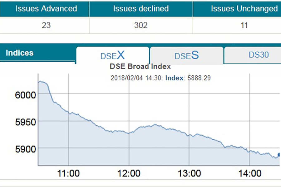 DSEX, the prime index of the DSE, plunged 2.21 per cent to settle at 5,888. It was the biggest single-day index fall in recent years since June 9, 2013 when DSEX slumped 145 points or 3.60 per cent.