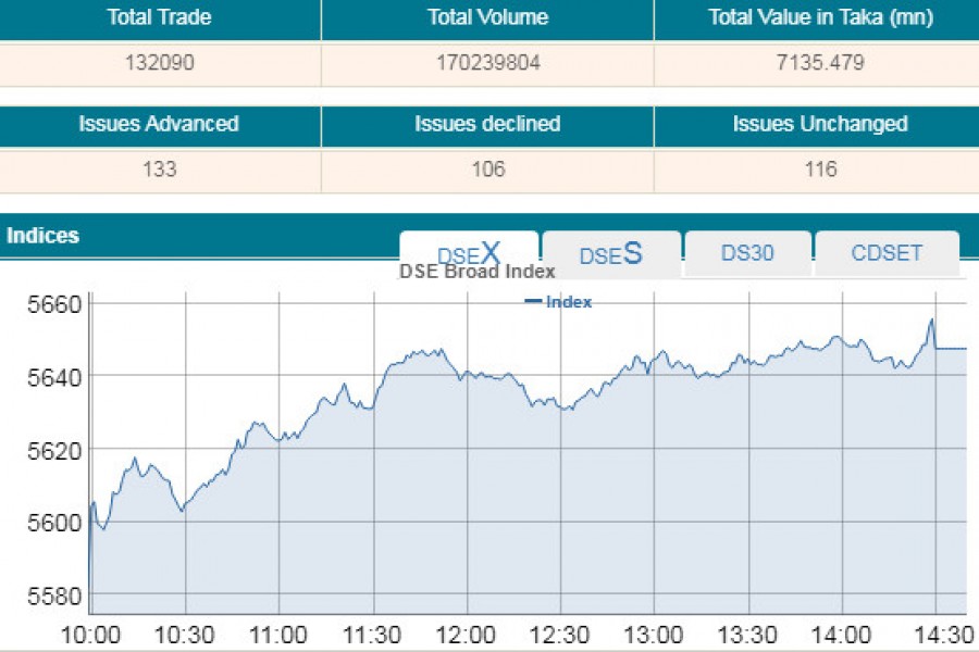 DSEX, the key index of the Dhaka Stock Exchange (DSE), went up by 65.80 points or 1.17 per cent to settle at 5,647. DSEX added roughly 83 points in the past two consecutive sessions.