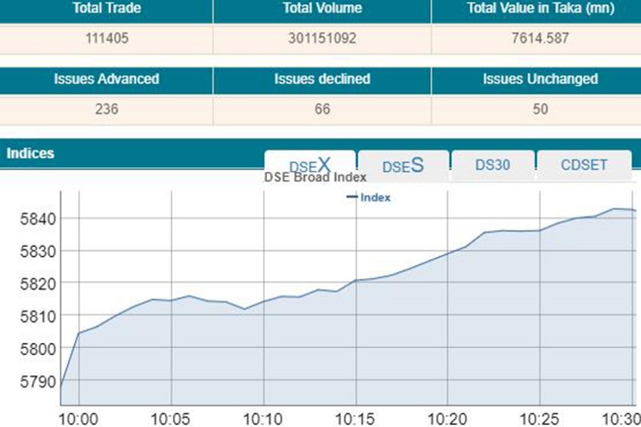 Following the previous two days’ major correction, the market opened sharply higher and DSEX, the prime index of the DSE, went up by 52.55 points or 0.90 per cent to reach at 5,840 within the first 30 minutes of trading when the report was filed at 10:30 am.