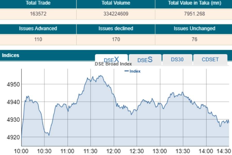 DSEX, the key index of the Dhaka Stock Exchange (DSE), went up by 9.63 points or 0.19 per cent to settle at 4,928.