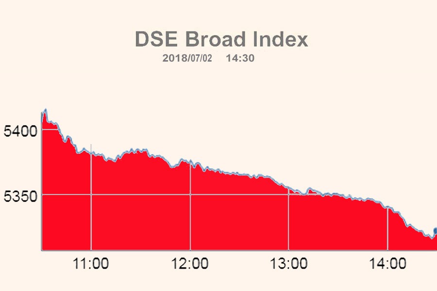DSEX, the benchmark index of the Dhaka Stock Exchange, settled at 5,322, slumping by 83 points or 1.53 per cent over the previous session.