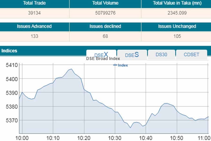 DSEX, the prime index of the DSE, went down by 14.36 points or 0.26 per cent to stand 5,370 points till then.