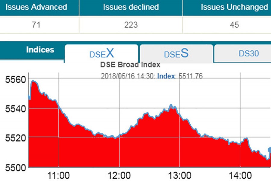 The two other indices also followed the suit. The DS30 index, comprising blue chips, fell 16.57 points or 0.79 per cent to finish at 2,055 while the DSE Shariah index lost 9.69 point or 0.74 per cent to settle at 1,291.