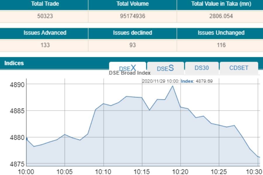 DSEX, the prime index of the DSE, went up by 7.94 points or 0.16 per cent to reach 4,877 points at 10:30 am.