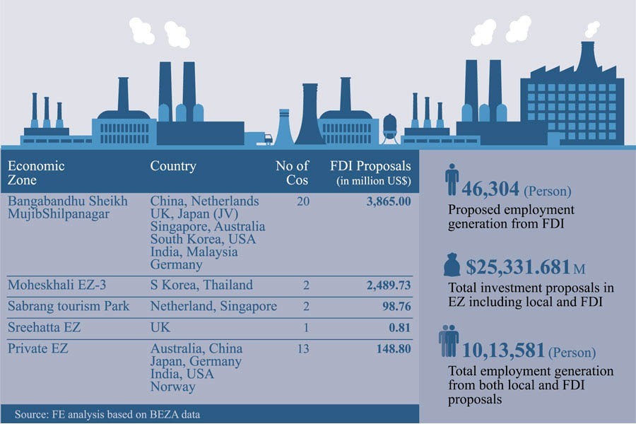 BSMS at Mirsarai, Feni and Sitakundo attracted the highest FDI proposals worth US$ 6.38 billion among the EZs under operation including private ones.