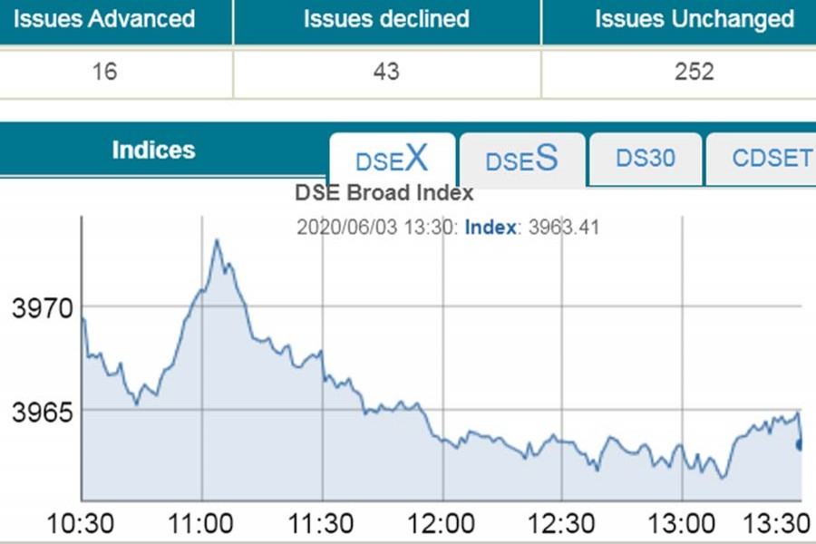 DSEX, the key index of the Dhaka Stock Exchange (DSE), went down by 6.17 points or 0.15 per cent to close at 3,963.