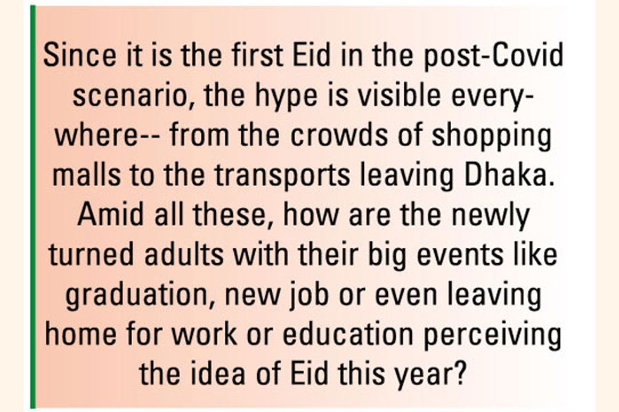 Like every year, once again Eid has arrived at our doors and is just a few days away. Since it is the first Eid in the post-Covid scenario, the hype is visible everywhere-- from the crowds of shopping malls to the transports leaving Dhaka. Amid all these, how are the newly turned adults with their big events like graduation, new job or even leaving home for work or education perceiving the idea of Eid this year?