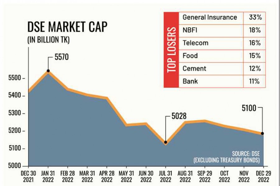 As much as Tk 322 billion, or 6 per cent, of the market capitalization got wiped off this year to Tk 5,100 billion on Thursday.
