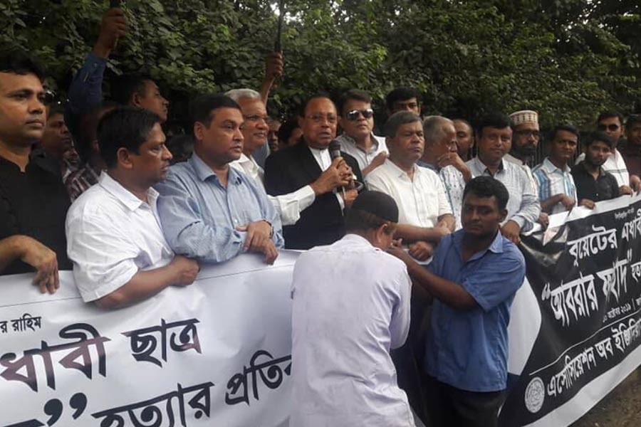 Bangladesh Sammilita Peshajibi Parishad arranged the programme in front of the Jatiya Press Club protesting against the murder of Buet student Abrar and demanding the release of BNP Chairperson Khaleda Zia.