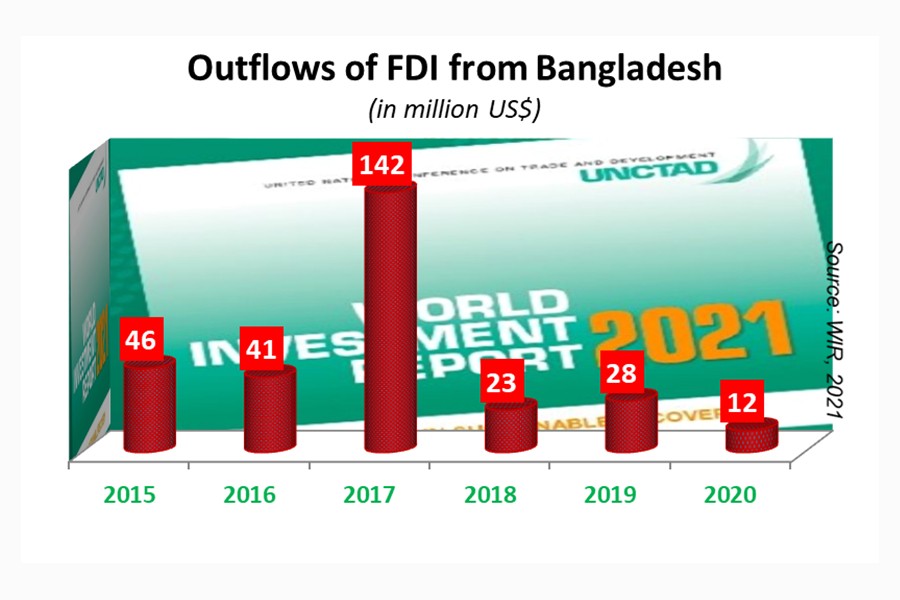 Net outflow of foreign direct investment (FDI) from Bangladesh declined further in 2020, according to World Investment Report (WIR) 2021.